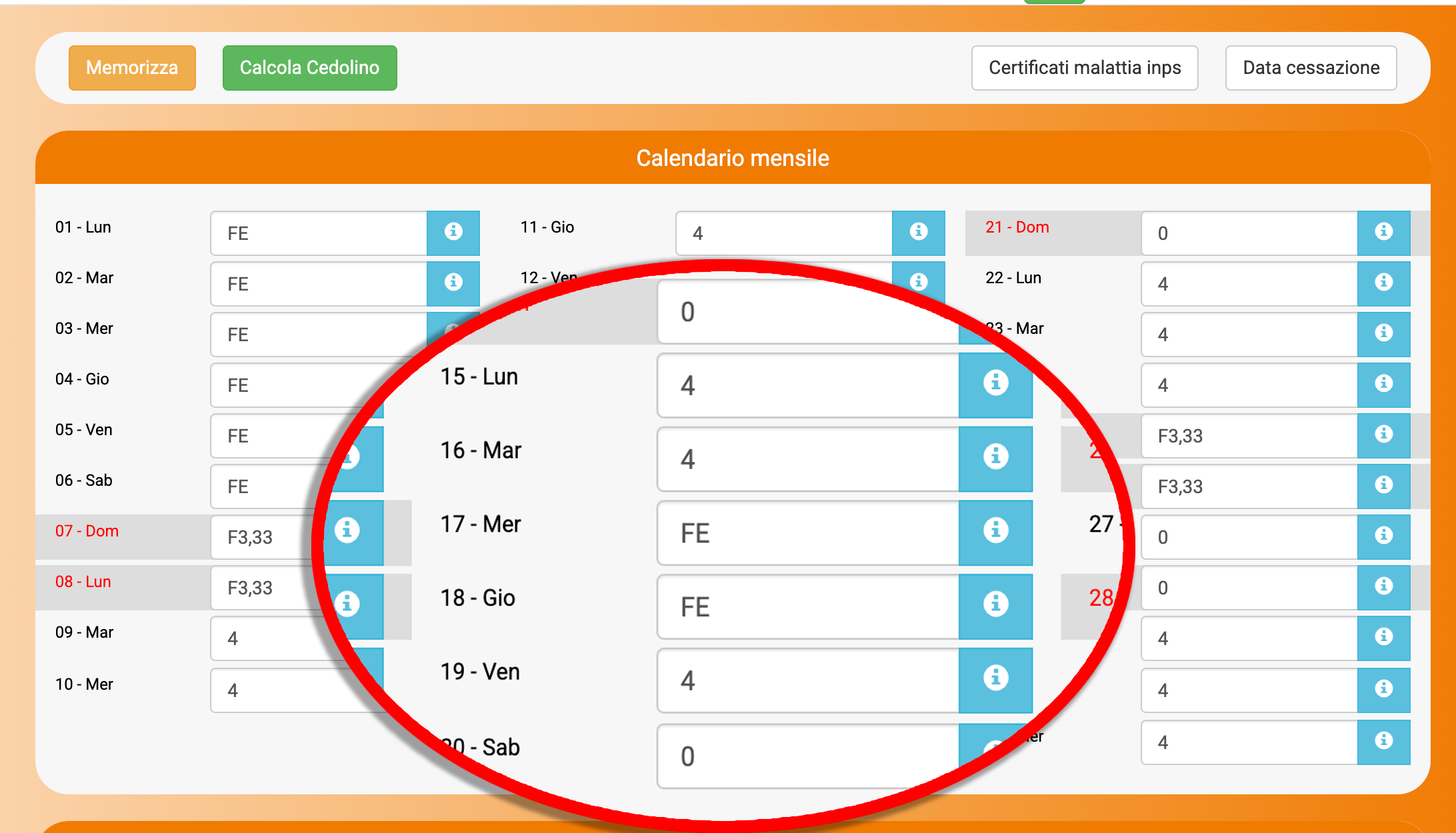 - Se richiede un giorno di ferie per il mercoledì, dobbiamo indicare FE su due giorni consecutivi (mercoledì e giovedì).