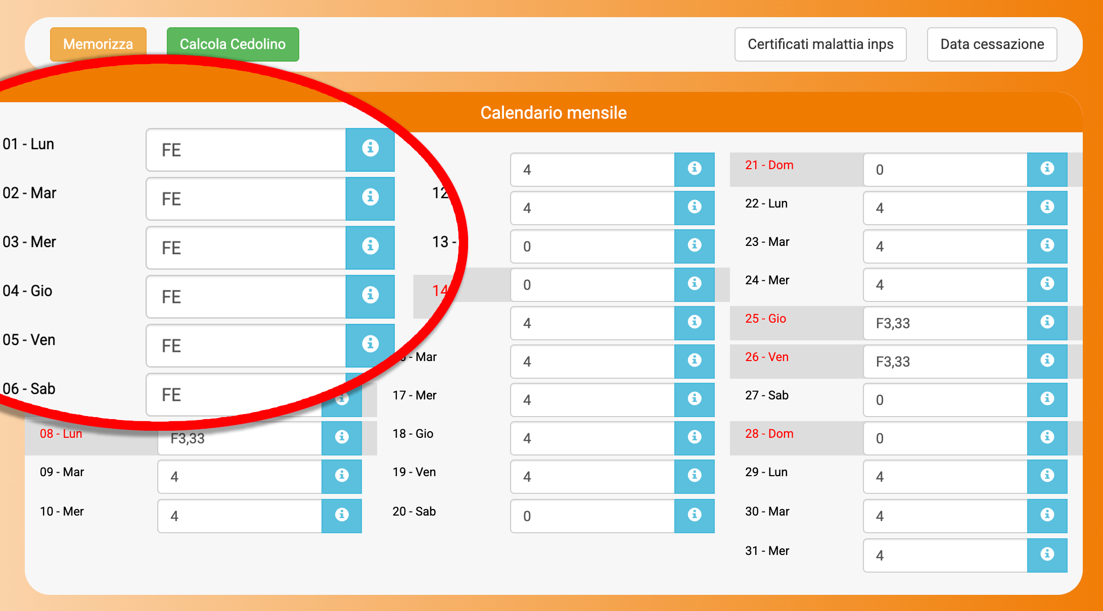 Per inserire un periodo di ferie nel cedolino, dobbiamo indicare la causale FE nel calendario mensile per ogni giorno dal lunedì al sabato a partire dal primo giorno di assenza sino al giorno che precede il rientro, anche se il collaboratore lavora solo alcuni di questi giorni.
